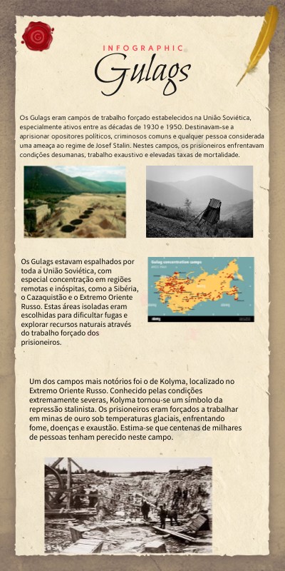 Os Gulags eram campos de trabalho forçado estabelecidos na União Soviética, especialmente ativos entre as décadas de 1930 e 1950. Destinavam-se a aprisionar opositores políticos, criminosos comuns e qualquer pessoa considerada uma ameaça ao regime de Josef Stalin. Nestes campos, os prisioneiros enfrentavam condições desumanas, trabalho exaustivo e elevadas taxas de mortalidade.