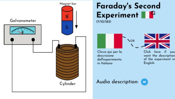 The experiment consists of inserting or removing a cylindrical magnet bar of ¾ inch in diameter and 8 and a half inches in length, inside a cylinder, which, at both extremities, has 8 coils fastened together like a bundle; this cylinder is connected, by long copper wires, to a galvanometer. Faraday notices that, when the magnet is inserted into the cylinder, the needle of the galvanometer moves; the same happens when the magnet is removed from the cylinder. The scientist comes to the conclusion that, whenever the magnet is inserted or removed, it produces a wave of electricity caused by the proximity of the magnet to the cylinder, without the need to stop it directly in place.