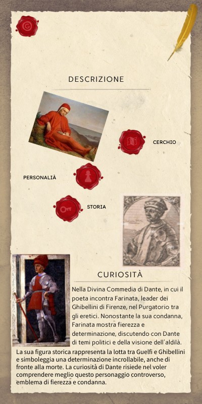 Nella Divina Commedia di Dante, in cui il poeta incontra Farinata, leader dei Ghibellini di Firenze, nel Purgatorio tra gli eretici. Nonostante la sua condanna, Farinata mostra fierezza e determinazione, discutendo con Dante di temi politici e della visione dell'aldilà.