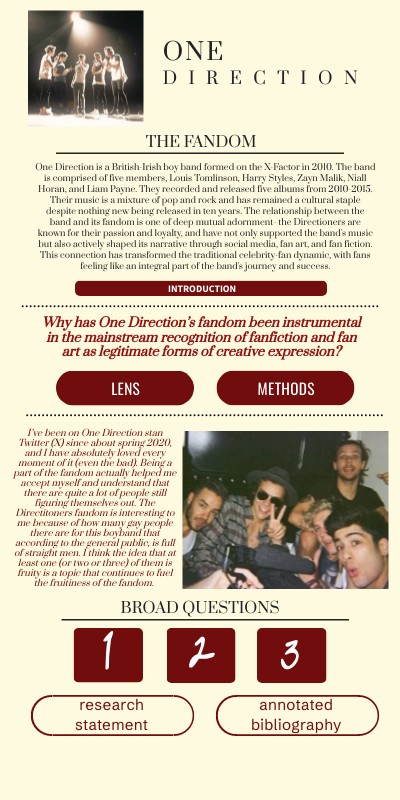 The critical lens applied to this research will be Queer & Gender-Centered. This lens is especially useful for examining how gender and sexuality norms, as well as representation, have shaped both the media One Direction produces and the media their fans create. One Direction’s fandom engages with themes of masculinity and sexuality, often subverting or reimagining these ideas through fanfiction and fan art. By focusing on queer and gendered expressions, this lens allows for an exploration of how fans challenge traditional notions of masculinity—especially as presented by the band—and reframe them through their own creative works. The research will investigate how the fandom reinterprets the band’s image, often portraying the members in ways that both challenge and reinforce gender norms, and how this reflects a broader societal shift in the understanding of gender and sexuality. Fanfiction has been a major form of creative expression within the One Direction fandom, and it plays a pivotal role in shaping how fans interact with the band's media. These fan-created works often delve into alternative explorations of gender and sexuality, challenging traditional norms and offering new representations of masculinity. Through fanfiction and fan art, fans create alternative universes where gender roles are fluid, and sexuality is explored beyond conventional boundaries. These works not only reflect fans' desires for more inclusive, diverse representations, but also influence how the broader public perceives the band, the fandom, and fan-created content. This transformation of traditional gender and sexual norms within the fandom is integral to the mainstream recognition of fanfiction and fan art. These creative outlets, often seen as subversive or niche, have been elevated to the point where they are now considered legitimate and valuable forms of creative expression.