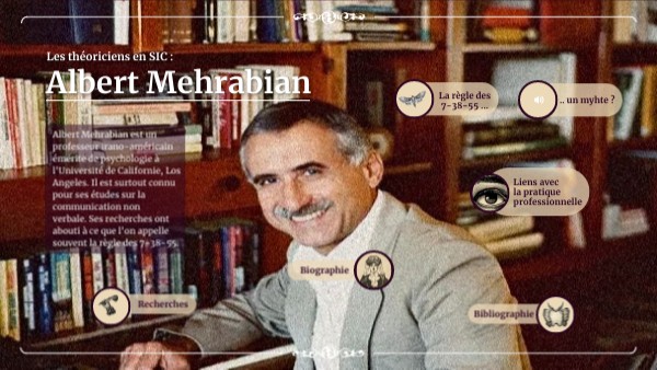 Né en 1939 dans une famille arménienne en Iran, Albert Mehrabian est un psychologue renommé et professeur émérite de psychologie à l'Université de Californie à Los Angeles (UCLA). Il est principalement connu pour ses travaux novateurs sur la communication verbale et non verbale. Bien que Mehrabian ne soit pas directement associé à l'École de Palo Alto, ses travaux partagent certaines similitudes avec les concepts développés par ce groupe de chercheurs. Il a d'abord suivi une formation d'ingénieur, obtenant un B.S. (Bachelor of Science) et un M.S. (Master of Science) au Massachusetts Institute of Technology (MIT), avant de se tourner vers la psychologie. Il a obtenu son doctorat à l'Université Clark et a commencé sa carrière d'enseignant-chercheur à l'UCLA en 1964. Tout au long de sa carrière, il a publié de nombreux livres et articles scientifiques.