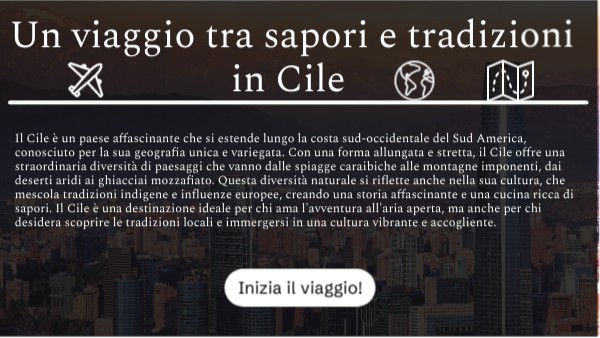 Il Cile è un paese affascinante che si estende lungo la costa sud-occidentale del Sud America, conosciuto per la sua geografia unica e variegata. Con una forma allungata e stretta, il Cile offre una straordinaria diversità di paesaggi che vanno dalle spiagge caraibiche alle montagne imponenti, dai deserti aridi ai ghiacciai mozzafiato. Questa diversità naturale si riflette anche nella sua cultura, che mescola tradizioni indigene e influenze europee, creando una storia affascinante e una cucina ricca di sapori. Il Cile è una destinazione ideale per chi ama l'avventura all'aria aperta, ma anche per chi desidera scoprire le tradizioni locali e immergersi in una cultura vibrante e accogliente.