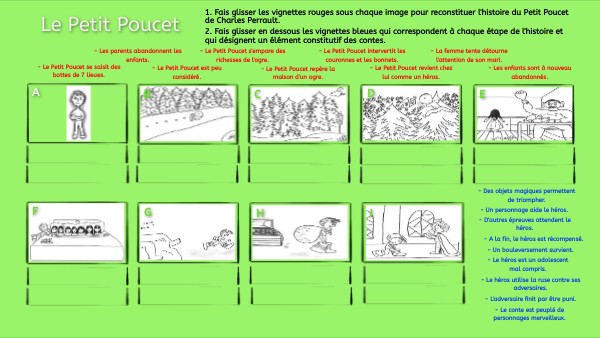1. Fais glisser les vignettes rouges sous chaque image pour reconstituer l'histoire du Petit Poucet de Charles Perrault.