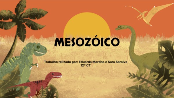O Mesozóico durou de 252 a 66 milhões de anos e foi marcado pela fragmentação da Pangeia, diversificação da fauna e flora e domínio dos dinossauros É dividido em Triássico (surgem os primeiros dinossauros e mamíferos), Jurássico (auge dos dinossauros e primeiros pássaros) e Cretáceo (primeiras plantas com flores e extinção dos dinossauros). Esse evento abriu caminho para a era Cenozóica e a ascensão dos mamíferos