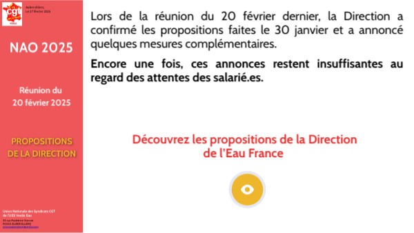 Lors de la réunion du 20 février dernier, la Direction a confirmé les propositions faites le 30 janvier et a annoncé quelques mesures complémentaires. Encore une fois, ces annonces restent insuffisantes au regard des attentes des salarié.es.