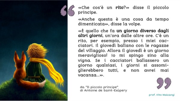 «Che cos’è un rito?» disse il piccolo principe. «Anche questa è una cosa da tempo dimenticata», disse la volpe. «È quello che fa un giorno diverso dagli altri giorni, un’ora dalle altre ore. C’è un rito, per esempio, presso i miei cac-ciatori. Il giovedì ballano con le ragazze del villaggio. Allora il giovedì è un giorno meraviglioso! Io mi spingo sino alla vigna. Se i cacciatori ballassero un giorno qualsiasi, i giorni si assomi-glierebbero tutti, e non avrei mai vacanza...».