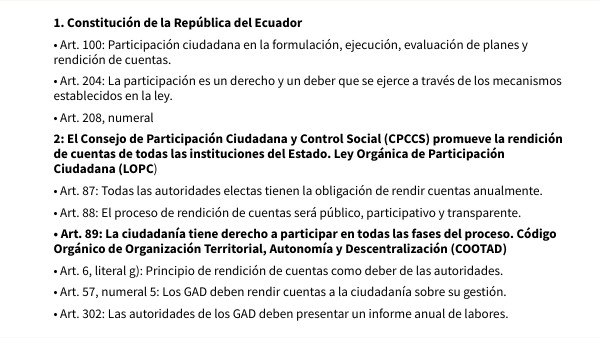 1. Constitución de la República del Ecuador • Art. 100: Participación ciudadana en la formulación, ejecución, evaluación de planes y rendición de cuentas. • Art. 204: La participación es un derecho y un deber que se ejerce a través de los mecanismos establecidos en la ley. • Art. 208, numeral 2: El Consejo de Participación Ciudadana y Control Social (CPCCS) promueve la rendición de cuentas de todas las instituciones del Estado. Ley Orgánica de Participación Ciudadana (LOPC) • Art. 87: Todas las autoridades electas tienen la obligación de rendir cuentas anualmente. • Art. 88: El proceso de rendición de cuentas será público, participativo y transparente. • Art. 89: La ciudadanía tiene derecho a participar en todas las fases del proceso. Código Orgánico de Organización Territorial, Autonomía y Descentralización (COOTAD) • Art. 6, literal g): Principio de rendición de cuentas como deber de las autoridades. • Art. 57, numeral 5: Los GAD deben rendir cuentas a la ciudadanía sobre su gestión. • Art. 302: Las autoridades de los GAD deben presentar un informe anual de labores.