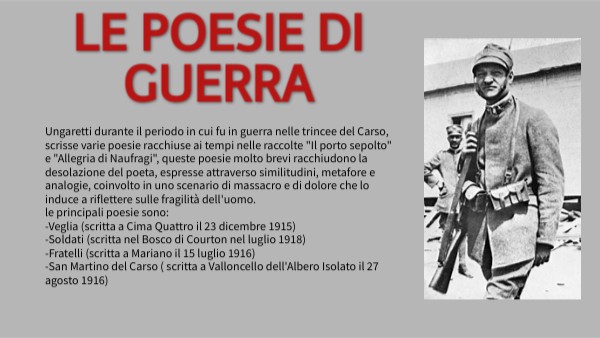 Ungaretti durante il periodo in cui fu in guerra nelle trincee del Carso, scrisse varie poesie racchiuse ai tempi nelle raccolte "Il porto sepolto" e "Allegria di Naufragi", queste poesie molto brevi racchiudono la desolazione del poeta, espresse attraverso similitudini, metafore e analogie, coinvolto in uno scenario di massacro e di dolore che lo induce a riflettere sulle fragilità dell'uomo.le principali poesie sono: -Veglia (scritta a Cima Quattro il 23 dicembre 1915) -Soldati (scritta nel Bosco di Courton nel luglio 1918) -Fratelli (scritta a Mariano il 15 luglio 1916) -San Martino del Carso ( scritta a Valloncello dell'Albero Isolato il 27 agosto 1916)