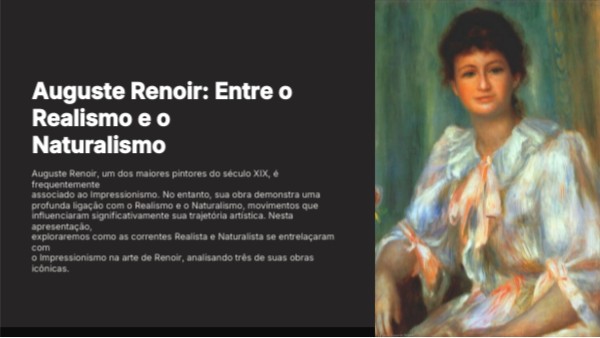 Auguste Renoir, um dos maiores pintores do século XIX, é frequentemente associado ao Impressionismo. No entanto, sua obra demonstra uma profunda ligação com o Realismo e o Naturalismo, movimentos que influenciaram significativamente sua trajetória artística. Nesta apresentação, exploraremos como as correntes Realista e Naturalista se entrelaçaram com o Impressionismo na arte de Renoir, analisando três de suas obras icônicas.