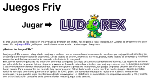 Si eres un amante de los juegos en línea y buscas diversión sin límites, has llegado al lugar indicado. En Ludorex te ofrecemos una gran colección de juegos FRIV gratis para que disfrutes sin necesidad de descargas ni registros. ¿Qué son los Juegos FRIV? Los juegos FRIV son una categoría de minijuegos en línea que se han vuelto extremadamente populares por su jugabilidad sencilla y su acceso gratuito desde cualquier dispositivo. Desde juegos de acción, aventuras, carreras, puzles, hasta juegos de estrategia y habilidad, en nuestra web Ludorex encontrarás horas de entretenimiento asegurado. En Ludorex hemos organizado los juegos en diferentes categorías para que encuentres rápidamente tu favorito. Los juegos de acción te permiten disfrutar de peleas épicas, disparos y aventuras llenas de adrenalina, mientras que los juegos de carreras te desafían a conducir a toda velocidad en circuitos impresionantes. Si prefieres poner a prueba tu inteligencia, los juegos de puzles ofrecen desafíos que te harán pensar. Para los amantes del deporte, hay opciones como fútbol, baloncesto y tenis, mientras que los juegos clásicos permiten revivir la nostalgia con títulos que marcaron época. Es 100% gratis, sin necesidad de pagar ni registrarte. Además, no necesitas descargas, ya que puedes jugar directamente desde tu navegador. La plataforma es compatible con dispositivos móviles y PC, y cuenta con una actualización constante en la que se añaden nuevos juegos cada semana.