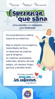 Encomendémonos a María, Salud de los enfermos: Bajo tu amparo nos acogemos, Santa Madre de Dios; no deseches las súplicas que te dirigimos en nuestras necesidades, antes bien, líbranos de todo peligro, ¡oh siempre Virgen, gloriosa y bendita! Amén.