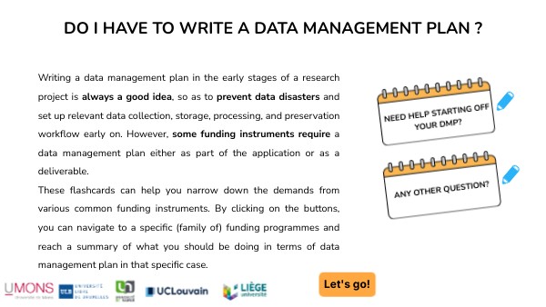 Writing a data management plan in the early stages of a research project is always a good idea, so as to prevent data disasters and set up relevant data collection, storage, processing, and preservation workflow early on. However, some funding instruments require a data management plan either as part of the application or as a deliverable. These flashcards can help you narrow down the demands from various common funding instruments. By clicking on the buttons, you can navigate to a specific (family of) funding programmes and reach a summary of what you should be doing in terms of data management plan in that specific case.