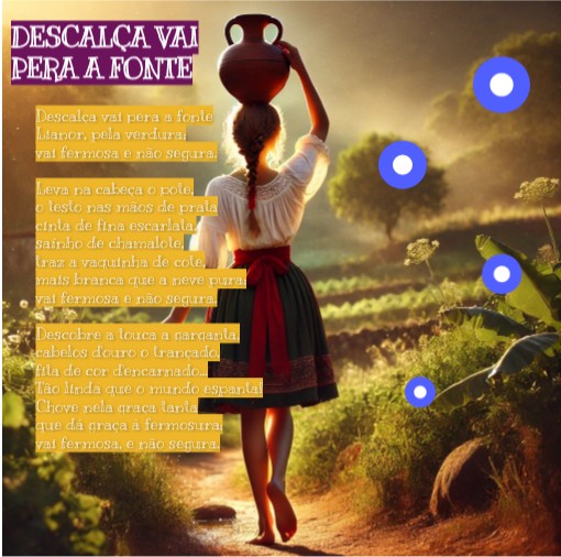 Descalça vai pera a fonte Lianor, pela verdura; vai fermosa e não segura. Leva na cabeça o pote, o testo nas mãos de prata cinta de fina escarlata, saínho de chamalote, traz a vaquinha de cote, mais branca que a neve pura; vai fermosa e não segura. Descobre a touca a garganta, cabelos d'ouro o trançado, fita de cor d'encarnado... Tão linda que o mundo espanta! Chove nela graça tanta que dá graça à fermosura; vai fermosa, e não segura.