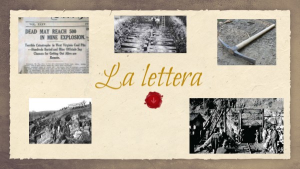 Nonostante ora io mi sia abituato a questo tipo di lavoro, non ti nego che i pericoli sono sempre tanti. Pensa che, per difenderci dal grisou, il pericoloso gas delle miniere, portiamo con noi un canarino. Anche io ne ho uno, potrebbe piacerti molto! Oggi, ad esempio, in miniera ci sono stati attimi di paura per tutti, mentre stavamo lavorando, il nostro canarino improvvisamente ha smesso di cantare, questo è stato un campanello di allarme, abbiamo lasciato tutti i picconi e siamo riusciti ad evacuare giusto in tempo, prima che i gas nocivi ci uccidessero. Purtroppo qui c’è rischio ogni giorno di morire, ma io ripeto non mollo! La mia forza siete voi, la mia famiglia e spero che possa quanto prima rivedervi. Intanto ti invio con questa lettera anche un gruzzoletto che so che tu ben custodirai. Dà un bacio a Giovanni da parte mia e ricordagli sempre che gli voglio bene ma non raccontargli tante cose di quanto ti ho detto. Non vedo l’ora di abbracciarvi di nuovo e ti anticipo che per Natale dell’anno prossimo, se va tutto bene, voglio tornare a Torella. Mi manca il nostro bel paese, tutto.