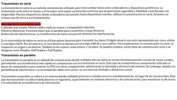 La transmición en serie es un método comúnmente utilizado para intercambiar datos entre ordenadores y dispositivos periféricos. La transmisión serie entre el emisor y el receptor está sujeta a protocolos estrictos que proporcionan seguridad y fiabilidad y han llevado a su longevidad. Muchos dispositivos, desde ordenadores personales hasta dispositivos móviles, utilizan la comunicación en serie. Echemos un vistazo más de cerca a sus fundamentos. Ventajas de la transmisión serie Cableado más simple: Menos cables implican costos y complejidad reducidos. Mayores distancias: Funciona mejor que el paralelo para conexiones a larga distancia. Reducción de interferencias: La transferencia de datos secuencial minimiza las interferencias. En la transmisión de datos en serie se utilizan pulsos binarios para transmitir los datos. El dígito binario uno está representado por cinco voltios o una lógica ALTA. Por el contrario, el cero binario se denota con una lógica BAJA o cero voltios. Para implementar la comunicación en serie, se requieren un origen y un destino. También se les conoce como emisor y receptor. Se pueden emplear varios tipos de comunicación serie y se designan como Simplex, Half Duplex y Full Duplex. La transmisión en paralelo es un método de comunicación donde múltiples bits de datos se envían simultáneamente a través de varios canales, permitiendo una transferencia más rápida en comparación con la transmisión en serie. Este tipo de transmisión es comúnmente utilizado en buses de computadora para conectar la CPU con otros componentes, optimizando la velocidad y eficiencia del sistema. Sin embargo, debido a la posibilidad de interferencia y la necesidad de cables más cortos, su uso está más limitado a distancias cortas. Transmisión en paralelo se refiere a un sistema donde múltiples procesos o señales ocurren simultáneamente, en lugar de ser secuenciales. Este tipo de transmisión se utiliza habitualmente en ingeniería, especialmente en sistemas eléctricos y de comunicación, para maximizar la eficiencia y la velocidad de la transferencia de información.