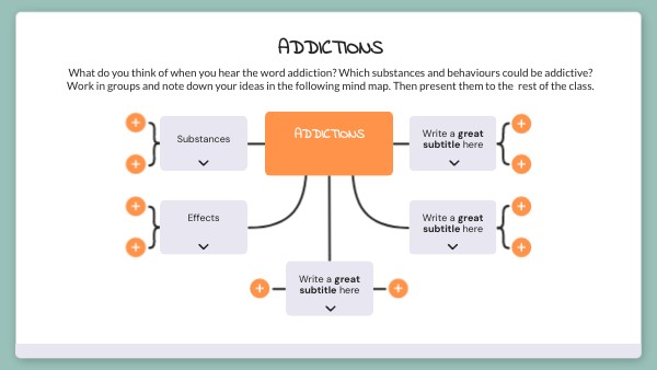 What do you think of when you hear the word addiction? Which substances and behaviours could be addictive? Work in groups and note down your ideas in the following mind map. Then present them to the rest of the class.