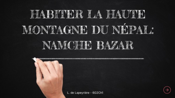 Le village de Namche Bazar Situé à 3 440 m d'altitude, le village de Namche Bazar est installé au pied des sommets himalayens de plus de 8 000 m. Pour s'adapter aux contraintes de la pente, les habitants ont construit des terrasses pour y installer leurs maisons, des champs, etc.