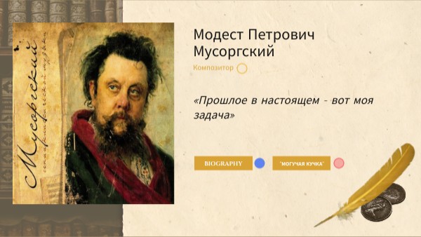 БИОГРАФИЯ Модест Петрович Мусоргский великий русский композитор, создававший свои произведения под влиянием русского фольклора и народного творчества. Его опера «Борис Годунов» была невероятно популярной, билеты на неё было трудно достать за долгое время до показа, отрывки из оперы люди пели всюду, их слышно было даже на улице. Музыка Мусоргского была самобытной, утонченной и прекрасной.