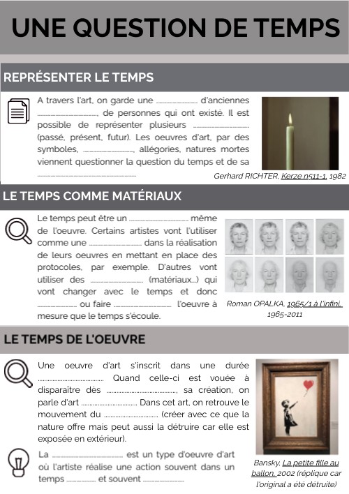 A travers l'art, on garde une ......................... d'anciennes ...................................., de personnes qui ont existé. Il est possible de représenter plusieurs .................................. (passé, présent, futur). Les oeuvres d'art, par des symboles, .............................., allégories, natures mortes viennent questionner la question du temps et de sa ............................................................