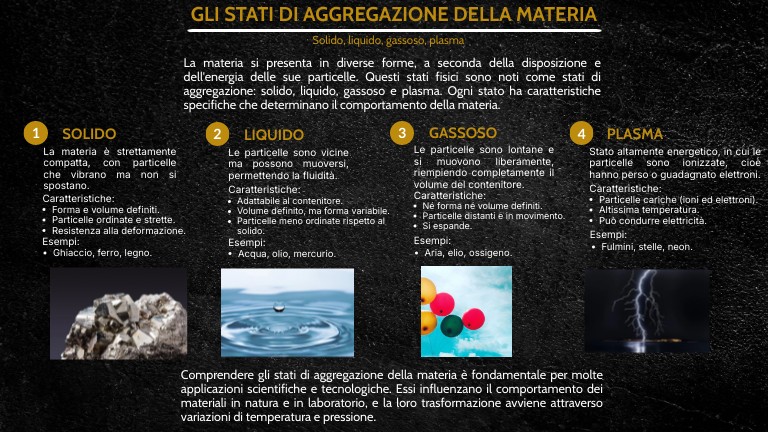 La materia si presenta in diverse forme, a seconda della disposizione e dell'energia delle sue particelle. Questi stati fisici sono noti come stati di aggregazione: solido, liquido, gassoso e plasma. Ogni stato ha caratteristiche specifiche che determinano il comportamento della materia.