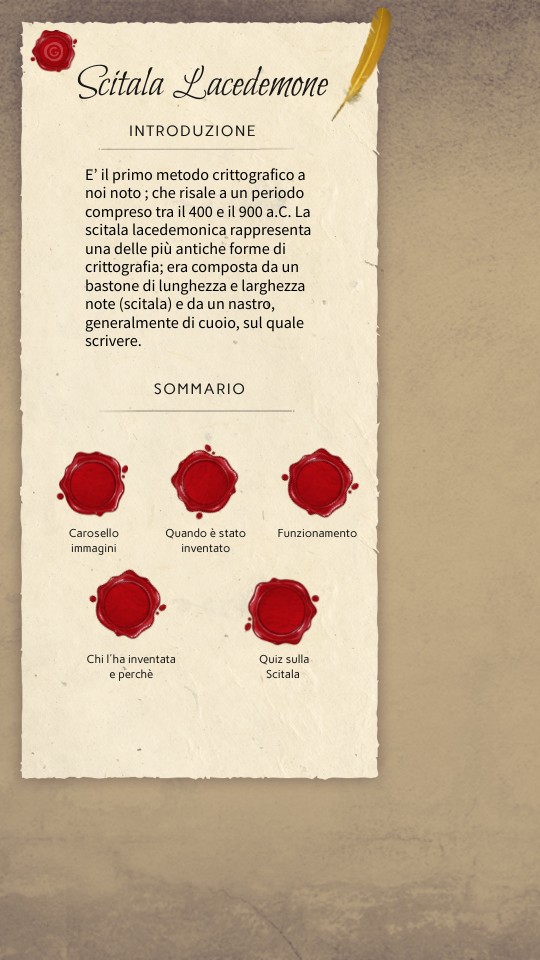 E’ il primo metodo crittografico a noi noto ; che risale a un periodo compreso tra il 400 e il 900 a.C. La scitala lacedemonica rappresenta una delle più antiche forme di crittografia; era composta da un bastone di lunghezza e larghezza note (scitala) e da un nastro, generalmente di cuoio, sul quale scrivere.