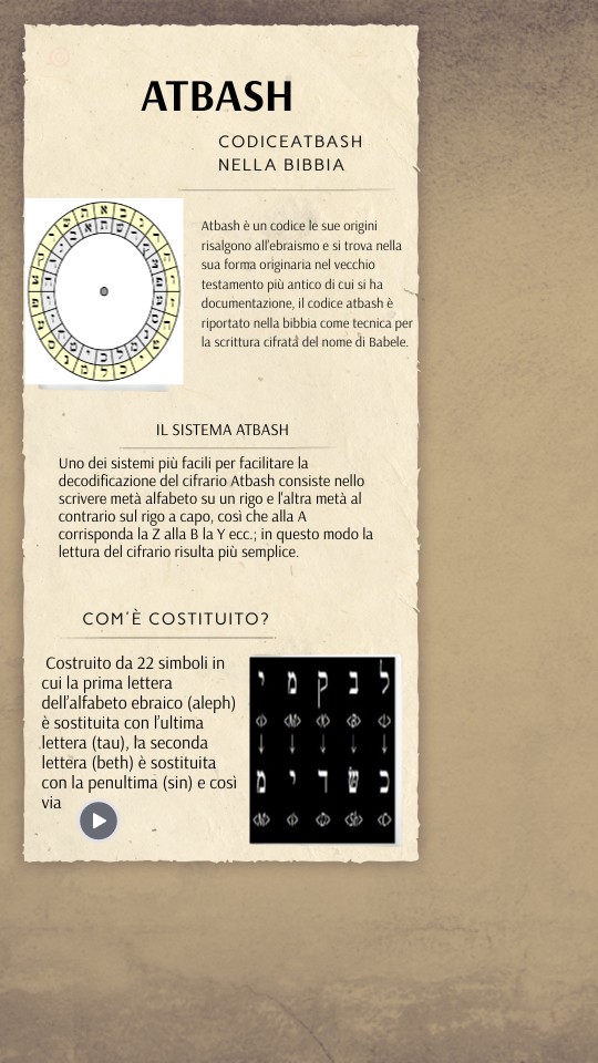 Costruito da 22 simboli in cui la prima lettera dell’alfabeto ebraico (aleph) è sostituita con l’ultima lettera (tau), la seconda lettera (beth) è sostituita con la penultima (sin) e così via