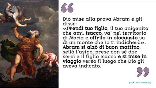 Dio mise alla prova Abram e gli disse: «Prendi tuo figlio, il tuo unigenito che ami, Isacco, va’ nel territorio di Moria e offrilo in olocausto su di un monte che io ti indicherò». Abram si alzò di buon mattino, sellò l’asino, prese con sé due servi e il figlio Isacco e si mise in viaggio verso il luogo che Dio gli aveva indicato.