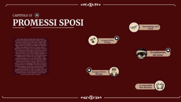 Nel capitolo 33 dei Promessi Sposi la narrazione si concentra sulla diffusione della peste a Milano, che segna un momento cruciale nella vicenda. Questo capitolo segue gli eventi drammatici legati al male che si abbatte sulla città, accentuando le difficoltà e le sofferenze del popolo. Il capitolo inizia con una descrizione della peste che devasta Milano, una calamità che porta con sé morte, panico e disperazione. Fra Cristoforo, che nel frattempo ha avuto un ruolo importante nella lotta contro le ingiustizie, continua a cercare di aiutare i più bisognosi, ma la situazione si fa sempre più difficile. La storia di Don Rodrigo prosegue, e il narratore ci mostra come la peste colpisce anche lui. Il personaggio di Don Rodrigo è ormai in balia della malattia e della sofferenza, e la sua vita sta per giungere a una conclusione tragica. Il Griso, uno dei più fedeli e crudeli servitori di Don Rodrigo, vive una sorte altrettanto infelice. Durante la peste, il Griso si trova a confrontarsi con il proprio destino. Alla fine del capitolo, il Griso muore di peste, un evento che simboleggia la fine della sua esistenza e la punizione per le sue malefatte. Il suo decesso segna un momento di giustizia morale, dove il male che ha compiuto viene finalmente punito dalla mano della natura, rappresentata dalla peste. In sintesi, il capitolo 33 unisce il tema della giustizia divina, la descrizione della peste come una forza distruttrice, e la fine di alcuni dei personaggi che incarnano il male, come Don Rodrigo e il Griso, in un intreccio di eventi tragici e risolutivi.