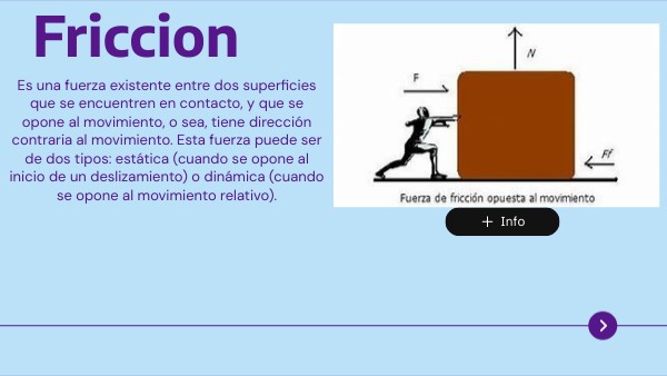 Es una fuerza existente entre dos superficies que se encuentren en contacto, y que se opone al movimiento, o sea, tiene dirección contraria al movimiento. Esta fuerza puede ser de dos tipos: estática (cuando se opone al inicio de un deslizamiento) o dinámica (cuando se opone al movimiento relativo).