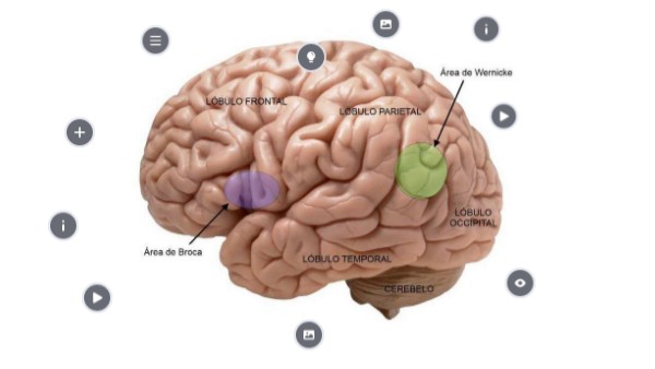 - Cerebro como eje central identificada claramente las áreas de Broca y de Wernicke.