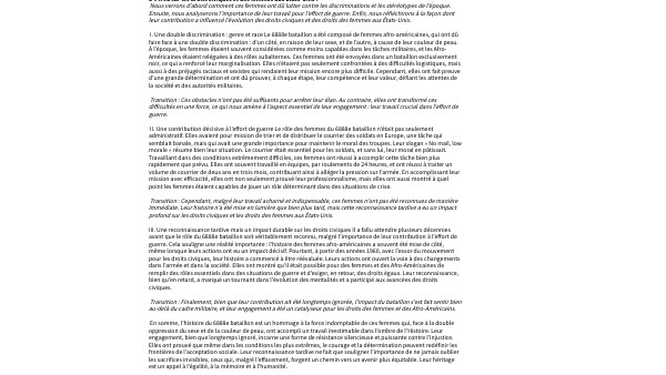La Seconde Guerre mondiale a impliqué de nombreuses femmes dans des rôles essentiels, mais une partie de leur contribution est restée largement ignorée. C'est le cas des femmes afro-américaines du 6888e bataillon, qui ont joué un rôle clé dans le tri et la distribution du courrier aux soldats en Europe, malgré les nombreuses discriminations auxquelles elles ont dû faire face. Leur travail, vital pour le moral des troupes, a été un défi de taille, car elles étaient confrontées à la fois aux inégalités de genre et aux préjugés raciaux. En quoi l'engagement des femmes du 6888e bataillon révèle-t-il les inégalités raciales et de genre et quel impact a-t-il eu sur les droits civiques et des femmes aux États-Unis ? Nous verrons d’abord comment ces femmes ont dû lutter contre les discriminations et les stéréotypes de l’époque. Ensuite, nous analyserons l’importance de leur travail pour l’effort de guerre. Enfin, nous réfléchirons à la façon dont leur contribution a influencé l’évolution des droits civiques et des droits des femmes aux États-Unis. I. Une double discrimination : genre et race Le 6888e bataillon a été composé de femmes afro-américaines, qui ont dû faire face à une double discrimination : d’un côté, en raison de leur sexe, et de l’autre, à cause de leur couleur de peau. À l’époque, les femmes étaient souvent considérées comme moins capables dans les tâches militaires, et les Afro-Américaines étaient reléguées à des rôles subalternes. Ces femmes ont été envoyées dans un bataillon exclusivement noir, ce qui a renforcé leur marginalisation. Elles n’étaient pas seulement confrontées à des difficultés logistiques, mais aussi à des préjugés raciaux et sexistes qui rendaient leur mission encore plus difficile. Cependant, elles ont fait preuve d’une grande détermination et ont dû prouver, à chaque étape, leur compétence et leur valeur, défiant les attentes de la société et des autorités militaires. Transition : Ces obstacles n’ont pas été suffisants pour arrêter leur élan. Au contraire, elles ont transformé ces difficultés en une force, ce qui nous amène à l’aspect essentiel de leur engagement : leur travail crucial dans l’effort de guerre. II. Une contribution décisive à l’effort de guerre Le rôle des femmes du 6888e bataillon n’était pas seulement administratif. Elles avaient pour mission de trier et de distribuer le courrier des soldats en Europe, une tâche qui semblait banale, mais qui avait une grande importance pour maintenir le moral des troupes. Leur slogan « No mail, low morale » résume bien leur situation. Le courrier était essentiel pour les soldats, et sans lui, leur moral en pâtissait. Travaillant dans des conditions extrêmement difficiles, ces femmes ont réussi à accomplir cette tâche bien plus rapidement que prévu. Elles ont souvent travaillé en équipes, par roulements de 24 heures, et ont réussi à traiter un volume de courrier de deux ans en trois mois, contribuant ainsi à alléger la pression sur l’armée. En accomplissant leur mission avec efficacité, elles ont non seulement prouvé leur professionnalisme, mais elles ont aussi montré à quel point les femmes étaient capables de jouer un rôle déterminant dans des situations de crise. Transition : Cependant, malgré leur travail acharné et indispensable, ces femmes n’ont pas été reconnues de manière immédiate. Leur histoire n’a été mise en lumière que bien plus tard, mais cette reconnaissance tardive a eu un impact profond sur les droits civiques et les droits des femmes aux États-Unis.III. Une reconnaissance tardive mais un impact durable sur les droits civiques Il a fallu attendre plusieurs décennies avant que le rôle du 6888e bataillon soit véritablement reconnu, malgré l’importance de leur contribution à l’effort de guerre. Cela souligne une réalité importante : l’histoire des femmes afro-américaines a souvent été mise de côté, même lorsque leurs actions ont eu un impact décisif. Pourtant, à partir des années 1960, avec l’essor du mouvement pour les droits civiques, leur histoire a commencé à être réévaluée. Leurs actions ont ouvert la voie à des changements dans l’armée et dans la société. Elles ont montré qu’il était possible pour des femmes et des Afro-Américaines de remplir des rôles essentiels dans des situations de guerre et d’exiger, en retour, des droits égaux. Leur reconnaissance, bien qu’en retard, a marqué un tournant dans l’évolution des mentalités et a participé aux avancées des droits civiques. Transition : Finalement, bien que leur contribution ait été longtemps ignorée, l’impact du bataillon s’est fait sentir bien au-delà du cadre militaire, et leur engagement a été un catalyseur pour les droits des femmes et des Afro-Américains. En somme, l’histoire du 6888e bataillon est un hommage à la force indomptable de ces femmes qui, face à la double oppression du sexe et de la couleur de peau, ont accompli un travail inestimable dans l’ombre de l’Histoire. Leur engagement, bien que longtemps ignoré, incarne une forme de résistance silencieuse et puissante contre l'injustice. Elles ont prouvé que même dans les conditions les plus extrêmes, le courage et la détermination peuvent redéfinir les frontières de l’acceptation sociale. Leur reconnaissance tardive ne fait que souligner l'importance de ne jamais oublier les sacrifices invisibles, ceux qui, malgré l'effacement, forgent un chemin vers un avenir plus équitable. Leur héritage est un appel à l’égalité, à la mémoire et à l’humanité.