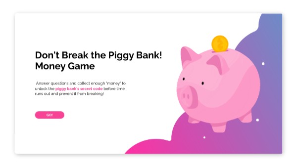 Answer questions and collect enough "money" to unlock the piggy bank's secret code before time runs out and prevent it from breaking!