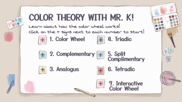 Learn about how the color wheel works!Click on the + signs next to each number to start!