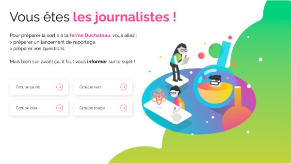 Pour préparer la sortie à la ferme Duchateau, vous allez : > préparer un lancement de reportage, > préparer vos questions. Mais bien sûr, avant ça, il faut vous informer sur le sujet !