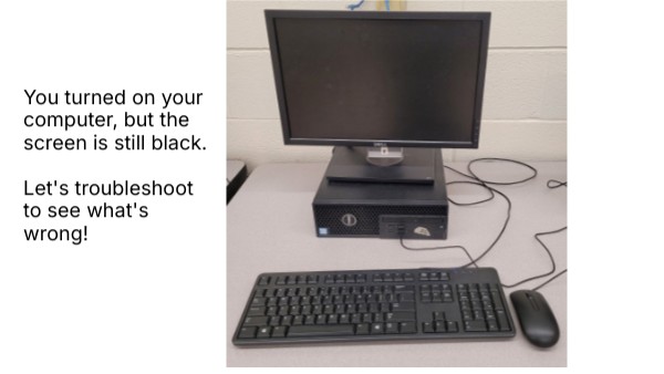 You turned on your computer, but the screen is still black. Let's troubleshoot to see what's wrong!