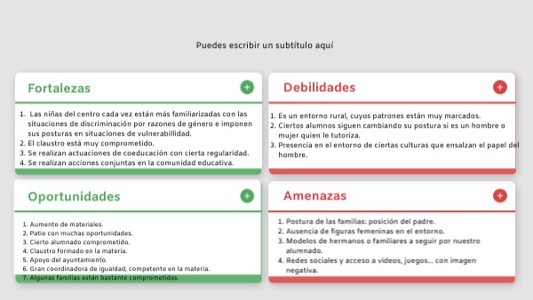 diagnóstico de la realidad de tu centro en relación con los distintos aspectos apuntados para abordar la coeducación. En concreto, te pedimos que realices una reflexión profundizando en las dificultades y oportunidades (un DAFO) que encuentras para la puesta en marcha de las diferentes actuaciones c
