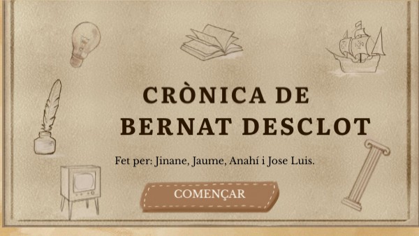 https://es.slideshare.net/Josepclim/crnica-de-bernat-desclot https://www.enciclopedia.cat/diccionari-dhistoriografia-catalana/bernat-desclot https://meritxellperis.wordpress.com/wp-content/uploads/2018/09/1-val-tema-2-17-18-tema-2.pdf https://prezi.com/p/lpumpyx29bna/cronica-de-bernat-desclot/ Llibre de Llengua i Literartura, voramar Santillana.