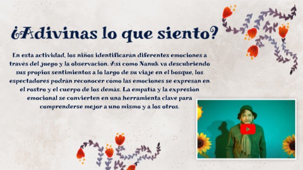 En esta actividad, los niños identificarán diferentes emociones a través del juego y la observación. Así como Nanuk va descubriendo sus propios sentimientos a lo largo de su viaje en el bosque, los espectadores podrán reconocer cómo las emociones se expresan en el rostro y el cuerpo de los demás. La empatía y la expresión emocional se convierten en una herramienta clave para comprenderse mejor a uno mismo y a los otros.