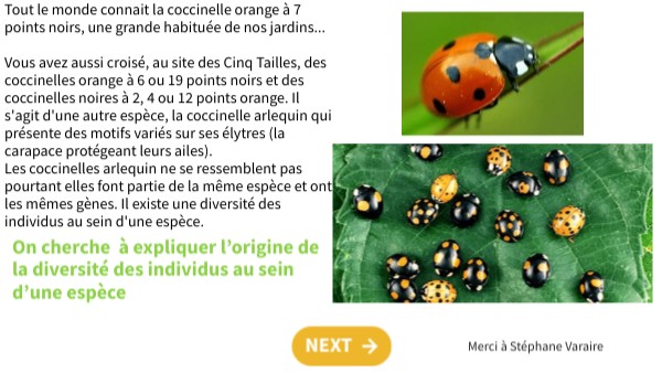 Consigne : A l'aide du genial'ly, : 1-Localiser et déterminer, en justifiant, le gène responsable des motifs (couleur et points) des élytres des coccinelles 2- Séquencer l’ADN correspondant à ce gène pour obtenir les séquences de ses allèles (versions) puis les comparer à l’aide de Genigen2 (voir fiche aide) 3- Expliquer l’origine de la diversité des individus au sein d’une espèce