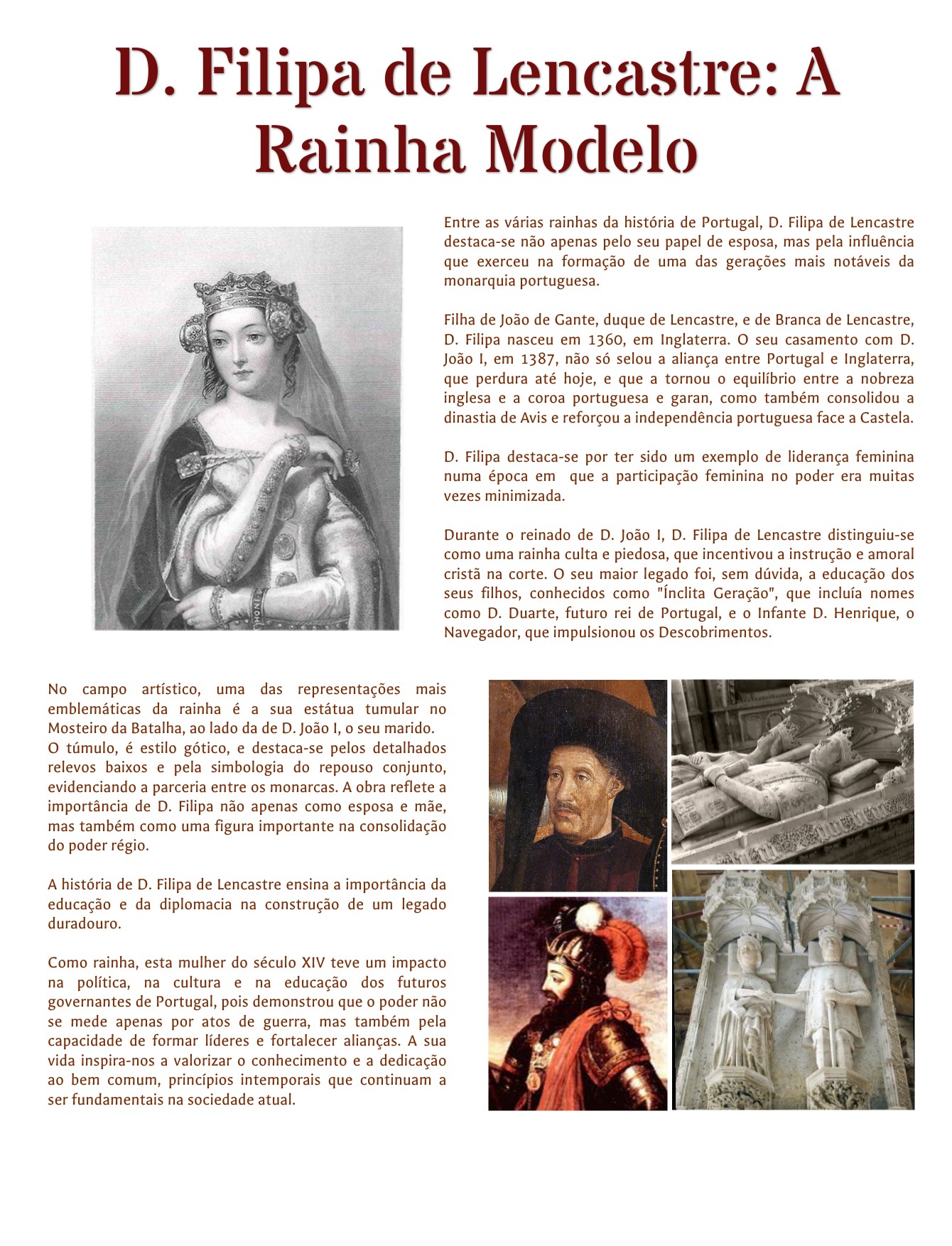 Entre as várias rainhas da história de Portugal, D. Filipa de Lencastre destaca-se não apenas pelo seu papel de esposa, mas pela influência que exerceu na formação de uma das gerações mais notáveis da monarquia portuguesa. Filha de João de Gante, duque de Lencastre, e de Branca de Lencastre, D. Filipa nasceu em 1360, em Inglaterra. O seu casamento com D. João I, em 1387, não só selou a aliança entre Portugal e Inglaterra, que perdura até hoje, e que a tornou o equilíbrio entre a nobreza inglesa e a coroa portuguesa e garan, como também consolidou a dinastia de Avis e reforçou a independência portuguesa face a Castela. D. Filipa destaca-se por ter sido um exemplo de liderança feminina numa época em que a participação feminina no poder era muitas vezes minimizada. Durante o reinado de D. João I, D. Filipa de Lencastre distinguiu-se como uma rainha culta e piedosa, que incentivou a instrução e amoral cristã na corte. O seu maior legado foi, sem dúvida, a educação dos seus filhos, conhecidos como "Ínclita Geração", que incluía nomes como D. Duarte, futuro rei de Portugal, e o Infante D. Henrique, o Navegador, que impulsionou os Descobrimentos.
