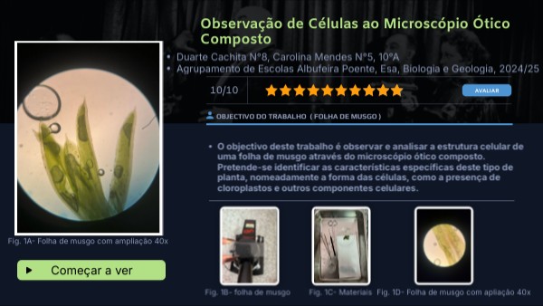 - O objectivo deste trabalho é observar e analisar a estrutura celular de uma folha de musgo através do microscópio ótico composto. Pretende-se identificar as características específicas deste tipo de planta, nomeadamente a forma das células, como a presença de cloroplastos e outros componentes celulares.