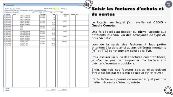 Le logiciel sur lequel j'ai travaillé est CEGID - Quadra Compta.Une fois l'accès au dossier du client, j'accède aux différents journaux via des acronymes de type AC pour "Achats". Lors de la saisie des factures, il faut prêter attention à la date ainsi qu'aux différents montants (HT et TTC) et notamment celui de la TVA. Pour assurer un suivi des factures comptabilisées, je n'oublie pas de tamponner ma facture afin d'éviter d'éventuels doublons. Enfin, une fois ces factures saisies, elles doivent être classées par mois afin de mieux s'y retrouver. Cette tâche m'a permis de réaliser à quel point ce métier nécessite d'être organisée.