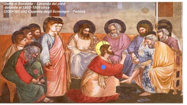 Il riquadro mostra Gesù e i suoi 12 apostoli durante la lavanda dei piedi, in un affresco all'interno della capella degli Scrovegni di Padova