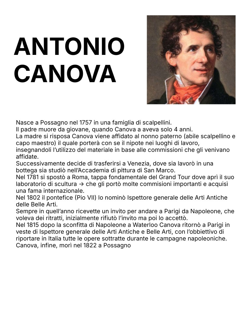 Nasce a Possagno nel 1757 in una famiglia di scalpellini. Il padre muore da giovane, quando Canova a aveva solo 4 anni. La madre si risposa Canova viene affidato al nonno paterno (abile scalpellino e capo maestro) il quale porterà con se il nipote nei luoghi di lavoro, insegnandoli l’utilizzo del materiale in base alle commissioni che gli venivano affidate. Successivamente decide di trasferirsi a Venezia, dove sia lavorò in una bottega sia studiò nell’Accademia di pittura di San Marco. Nel 1781 si spostò a Roma, tappa fondamentale del Grand Tour dove aprì il suo laboratorio di scultura -> che gli portò molte commisioni importanti e acquisì una fama internazionale. Nel 1802 il pontefice (Pio VII) lo nominò Ispettore generale delle Arti Antiche delle Belle Arti. Sempre in quell’anno ricevette un invito per andare a Parigi da Napoleone, che voleva dei ritratti, inizialmente rifiutò l’invito ma poi lo accettò. Nel 1815 dopo la sconfitta di Napoleone a Waterloo Canova ritornò a Parigi in veste di Ispettore generale delle Arti Antiche e Belle Arti, con l’obbiettivo di riportare in Italia tutte le opere sottratte durante le campagne napoleoniche. Canova, infine, morì nel 1822 a Possagno