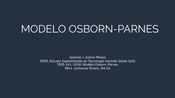 Jackniel J. García Massa DEPR, Escuela Especializada en Tecnologia Gerardo Sellés Solá TEED 161-1018: Modelo Osborn-Parnes Mtra. Joshanna Rivera, MA Ed