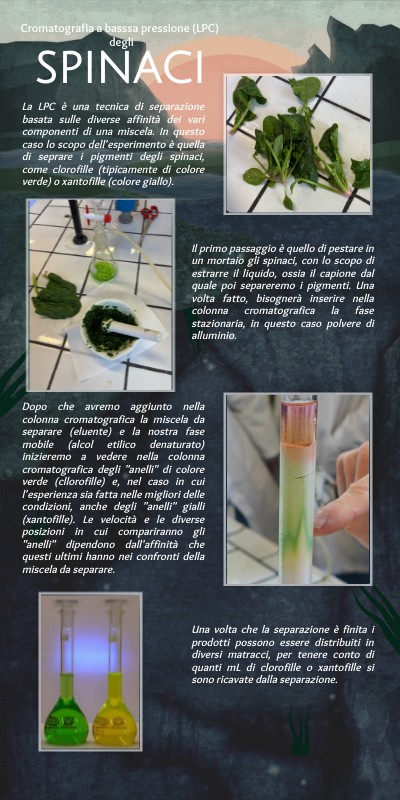 La LPC è una tecnica di separazione basata sulle diverse affinità dei vari componenti di una miscela. In questo caso lo scopo dell'esperimento è quella di seprare i pigmenti degli spinaci, come clorofille (tipicamente di colore verde) o xantofille (colore giallo).