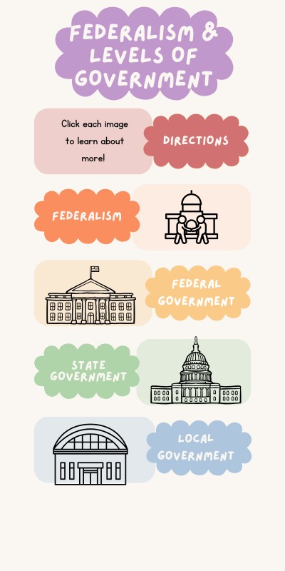 Federalism is a system of government where power is shared between a central government and smaller governments. In the United States, this means the national government is the center government and the state and local governments are the smaller governments. The national, state, and local governments each have their own responsibilities but also work together to make laws and serve the people. This system helps make sure no single part of the government has too much control or power.