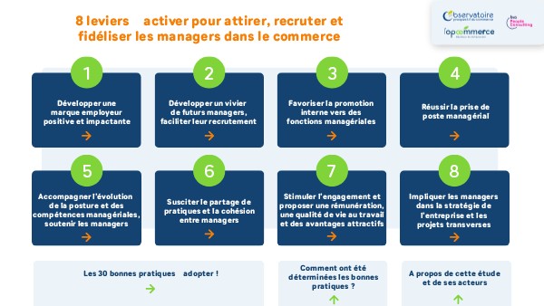 Les 30 bonnes pratiques ont été déterminées dans le cadre d’une étude visant à identifier les freins et leviers d’attractivité, de recrutement et de fidélisation des managers du commerce.