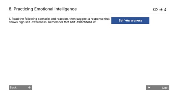 1. Read the following scenario and reaction, then suggest a response that shows high self-awareness. Remember that self-awareness is: