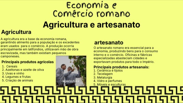 A agricultura era a base da economia romana, garantindo alimento para a população e os excedentes eram usados para o comércio. A produção ocorria principalmente em latifúndios, utilizavam mão de obra escravizada, mas também existiam pequenos camponeses.